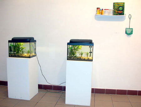 Two fish tanks were installed in the gallery space. One inhabited by female and second by male guppies - one of the most popular fish among domestic hobbyists.