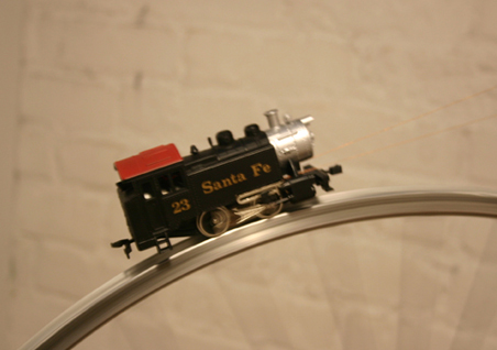 Kolejka elektryczna jest podłączona do zasilacza i za razem podtrzymywana przewodami, które przewodzą prąd. Przewody są przymocowane do ściany tak , aby pociąg balansował na kole. Grawitacja i tarcie powoduje ruch koła rowerowego, które zostało odpowiednio przekształcone do szerokości kół pociągu.