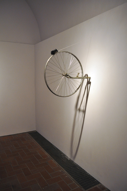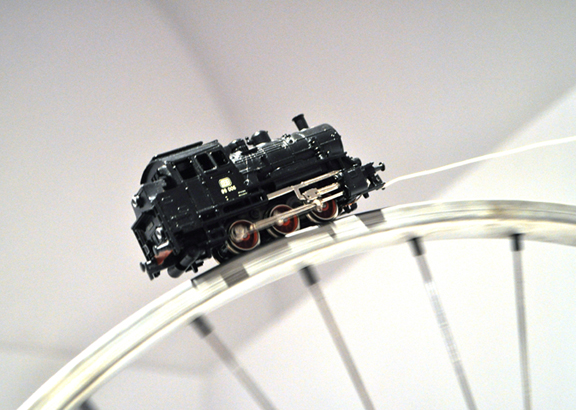 "Bridge II", 2010 Bike wheel, electric train, cord, power adaptor.