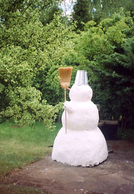 bucket, broom "Idzie zima" Akcja ogrodowa. Gips, wegiel, marchew, wiadro, miotla Poznan, czewiec 2001 Gipsowy balwan, zostal wybudowany w srodku lata na tylach mojego poznanskiego domu jako przypomnienie o chlodzie i nieuniknionosci zimy. Podjalem takze probe zlikwidowania balwana. |